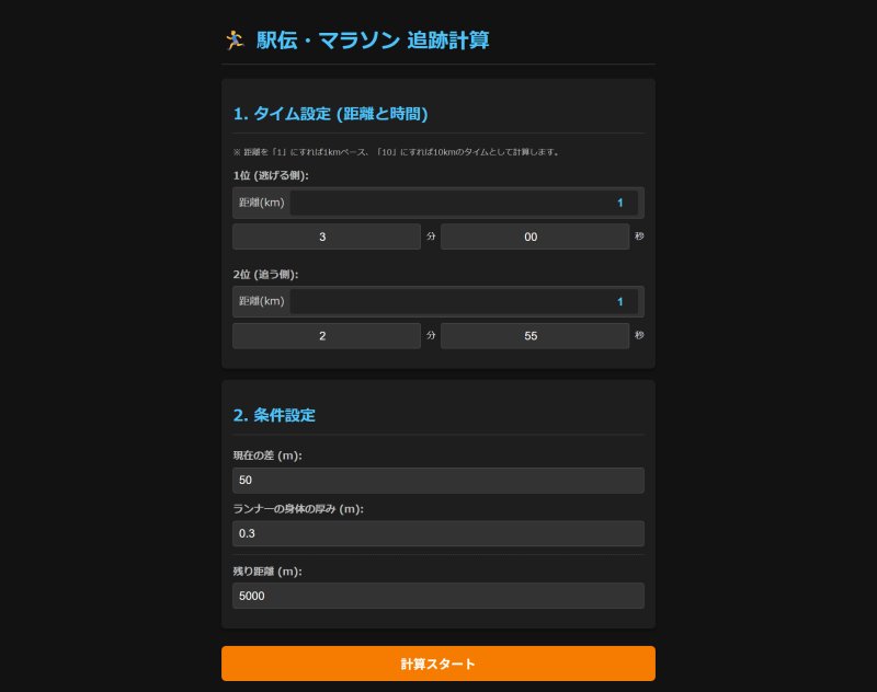 駅伝・マラソン 追跡計算 #Grok にて生成した車間距離計算を、#Gemini 用いて駅伝・マラソン追跡計算へ変更生成した。