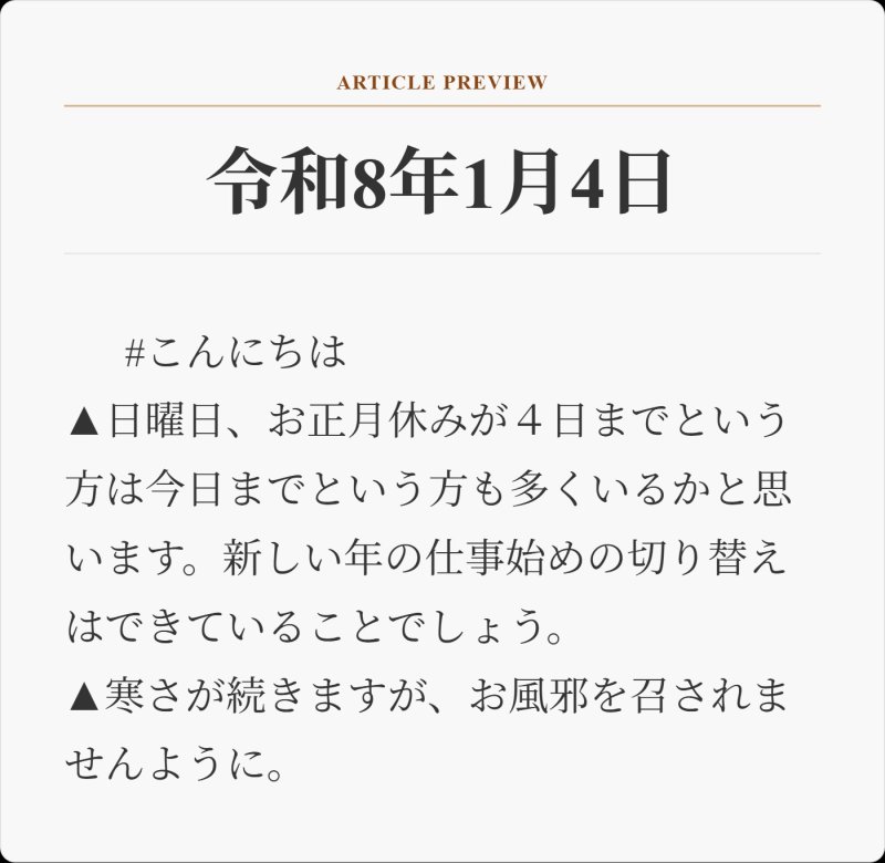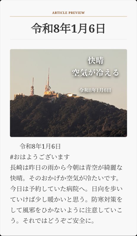 令和8年1月6日 #おはようございます 長崎は昨日の雨から今朝は青空が綺麗な快晴。そのおかげか空気が冷たいです。今日は予約していた病院へ。日向を歩いていけば少し暖かいと思う。防寒対策をして風邪をひかないように注意していこう。それではどうぞご安全に。
