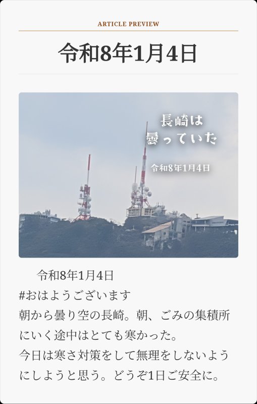 令和8年1月4日 #おはようございます 朝から曇り空の長崎。朝、ごみの集積所にいく途中はとても寒かった。 今日は寒さ対策をして無理をしないようにしようと思う。どうぞ1日ご安全に。