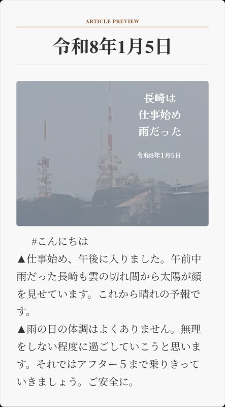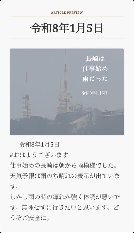 令和8年1月5日 #おはようございます 仕事始めの長崎は朝から雨模様でした。天気予報は雨のち晴れの表示が出ています。 しかし雨の時の痺れが強く体調が悪いです。無理せずに行きたいと思います。どうぞご安全に。
