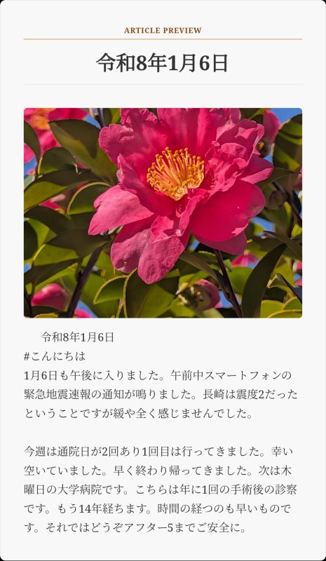 令和8年1月6日 #こんにちは 1月6日も午後に入りました。午前中スマートフォンの緊急地震速報の通知が鳴りました。長崎は震度2だったということですが緩や全く感じませんでした。 今週は通院日が2回あり1回目は行ってきました。幸い空いていました。早く終わり帰ってきました。次は木曜日の大学病院です。こちらは年に1回の手術後の診察です。もう14年経ちます。時間の経つのも早いものです。それではどうぞアフター5までご安全に。