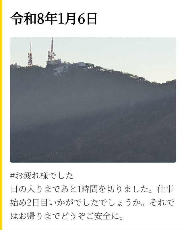 #お疲れ様でした 日の入りまであと1時間を切りました。仕事始め2日目いかがでしたでしょうか。それではお帰りまでどうぞご安全に。