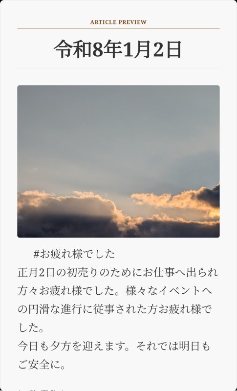 #お疲れ様でした 正月2日の初売りのためにお仕事へ出られ方々お疲れ様でした。様々なイベントへの円滑な進行に従事された方お疲れ様でした。 今日も夕方を迎えます。それでは明日もご安全に。