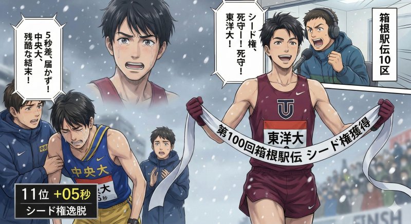 Geminiに箱根駅伝のゴール画像を生成してもらった。指示は5秒差でシードを落としたシーンというものだったが、なぜか実名の大学が出てしまった。
